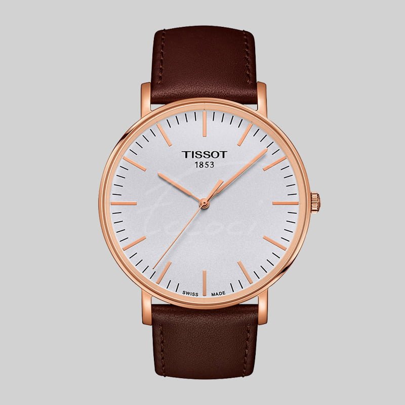 Tissot T109.610.36.031.00 T Classic Everytime Watch As it names indicates, this watch will be the winner everytime, for any occasion. A classical timeless design, the sleek and clean face of the Tissot Everytime singles it out as a very modern watch. The cool minimalism of the face leaves room for some fun experimentation with the bracelet. Featured here with rose gold PVD coated case and brown leather strap.